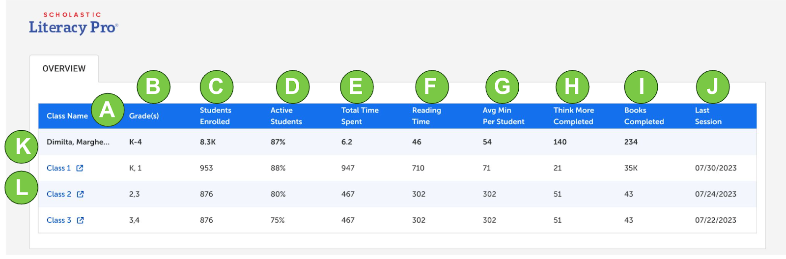L.) Each subsequent row lists an individual class’s values across each category. You can click on a class to be brought to that teacher’s Explore Page and view more in-depth information. (See Teacher Dashboard Literacy Pro Explore Page.)